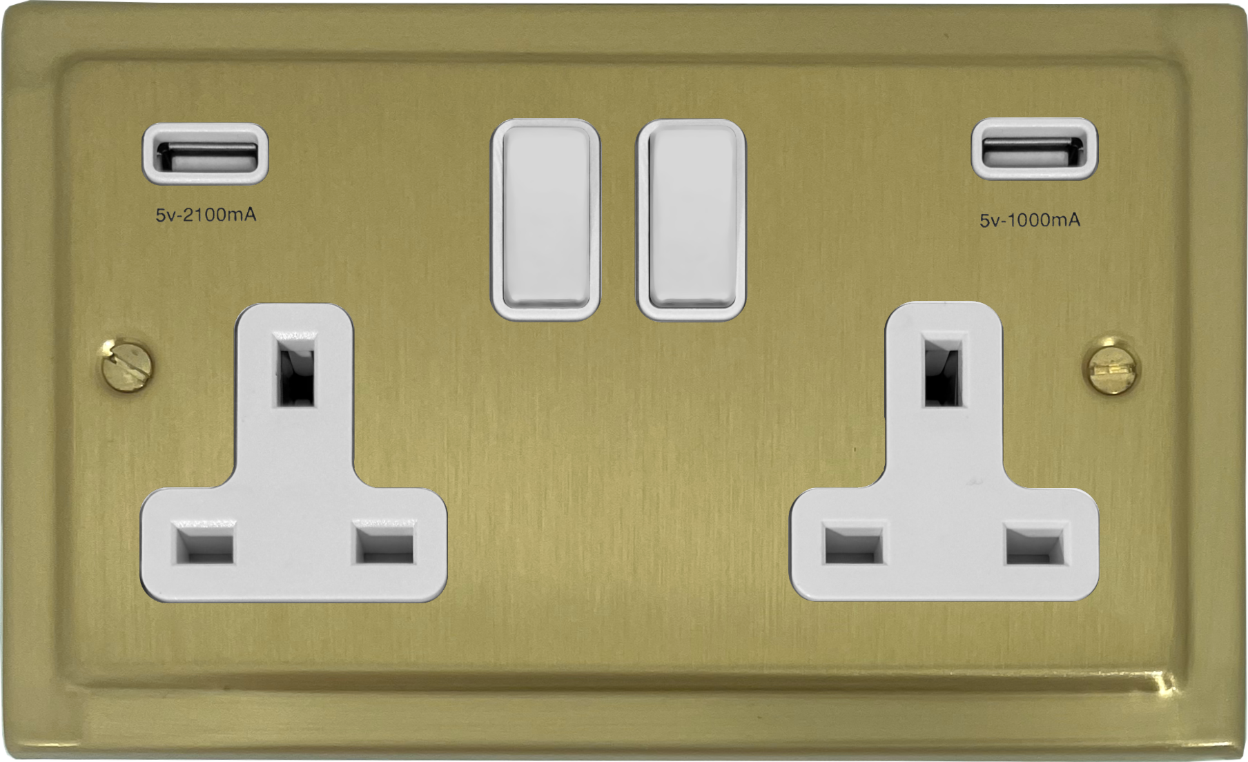 Trimline Satin Brass Double Socket with USB (White Switches) - G+H TSB910W