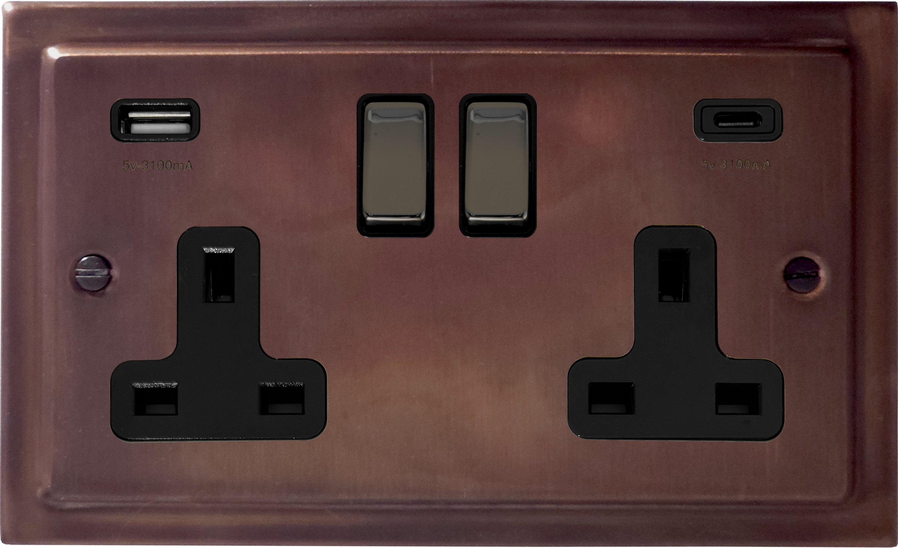 Trimline Tarnished Copper Double Socket with USB (USB-A and USB-C/Black Nickel Switches)