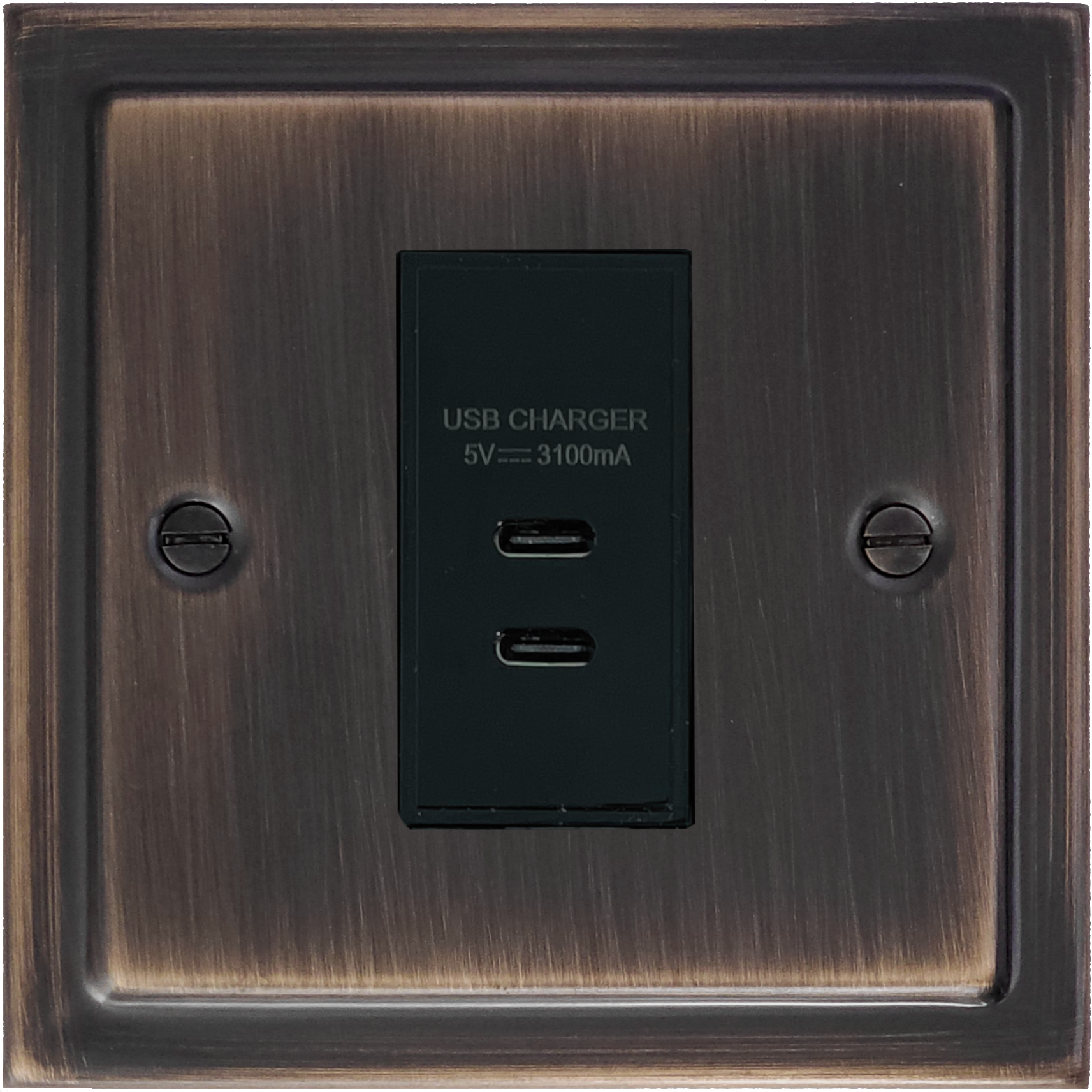 Victorian Antique Copper USB Charger (2x USB-C) (1 Gang/Black Insert) - G+H TAC42B