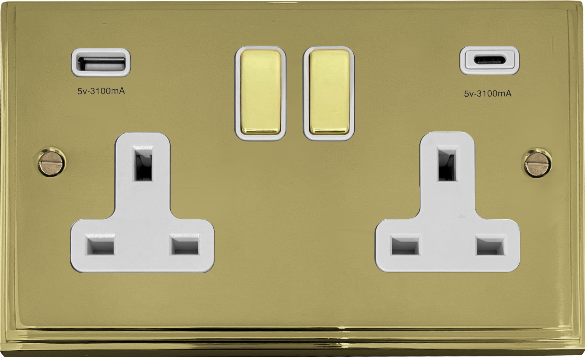 Victorian Cast Polished Brass Double Socket with USB (USB-A and USB-C/White Inserts Brass Switches) - G+H VB2911