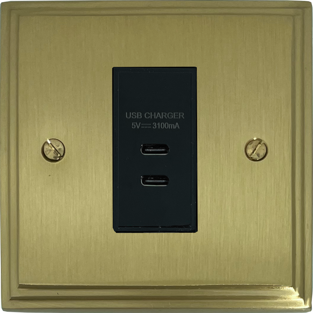 Victorian Cast Satin Brass USB Charger (2x USB-C) (1 Gang/Black Insert) - G+H VSB42B