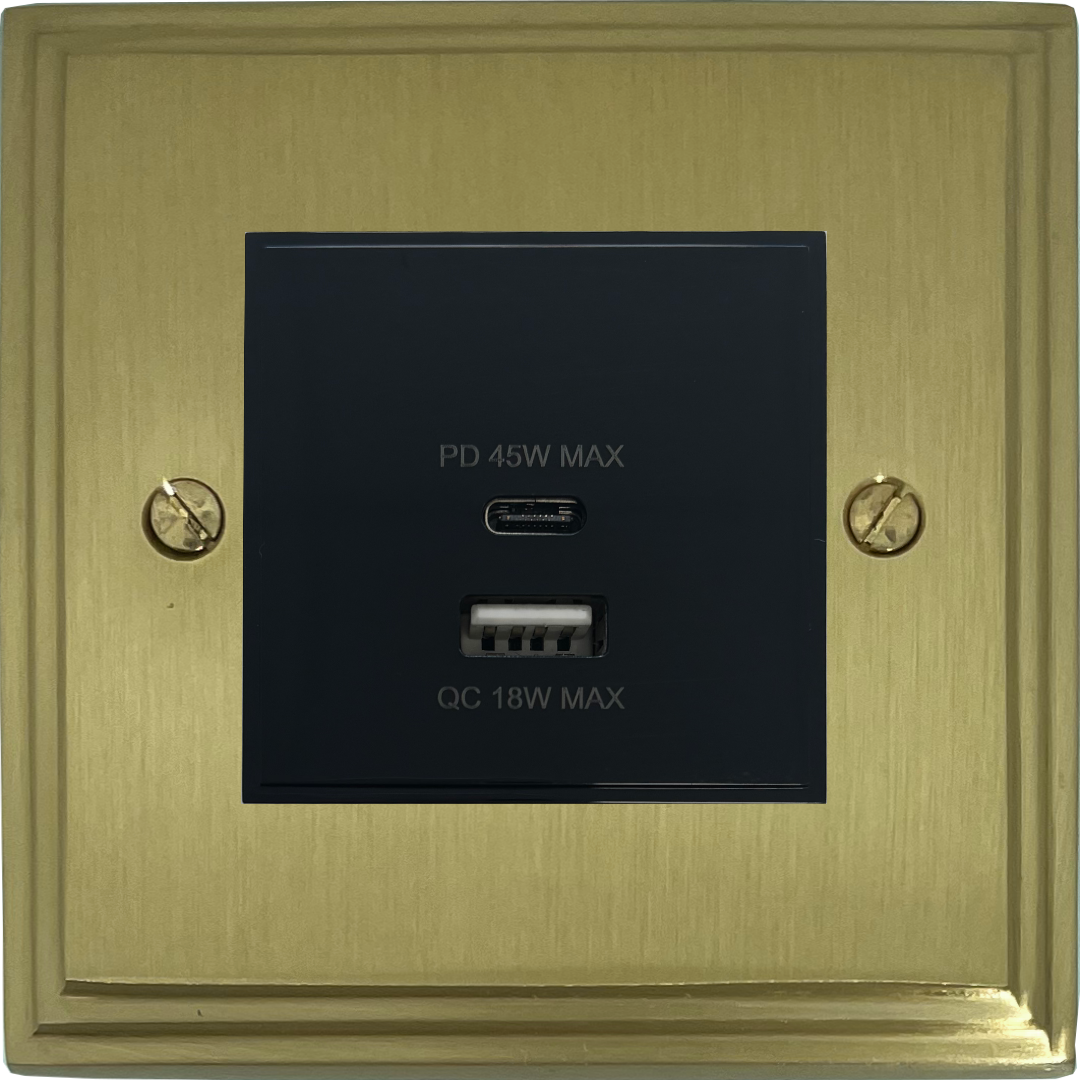 Victorian Cast Satin Brass USB Charger (Dual USB A + C Quick Charge) (1 Gang/Black Insert) - G+H VSB43B