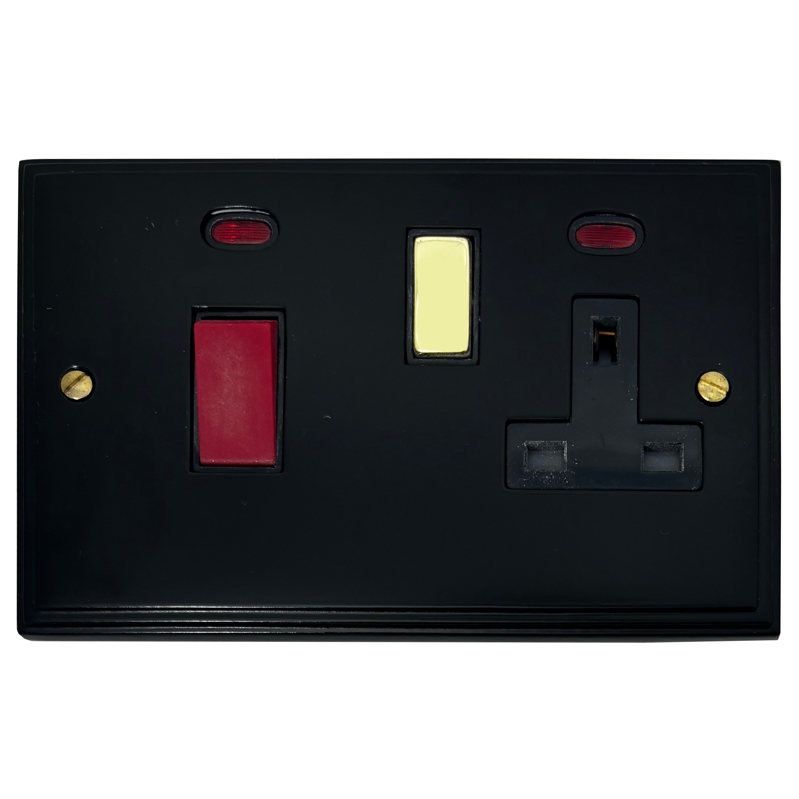 Victorian Matt Black Red Cooker Switch with Socket (Polished Brass Switch)