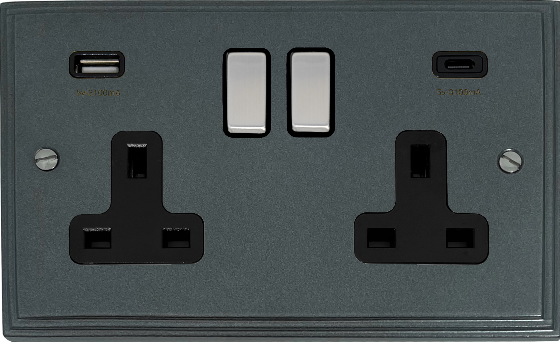 Victorian Pewter Double Socket with USB (USB-A and USB-C/Black Inserts/Satin Chrome Switches)