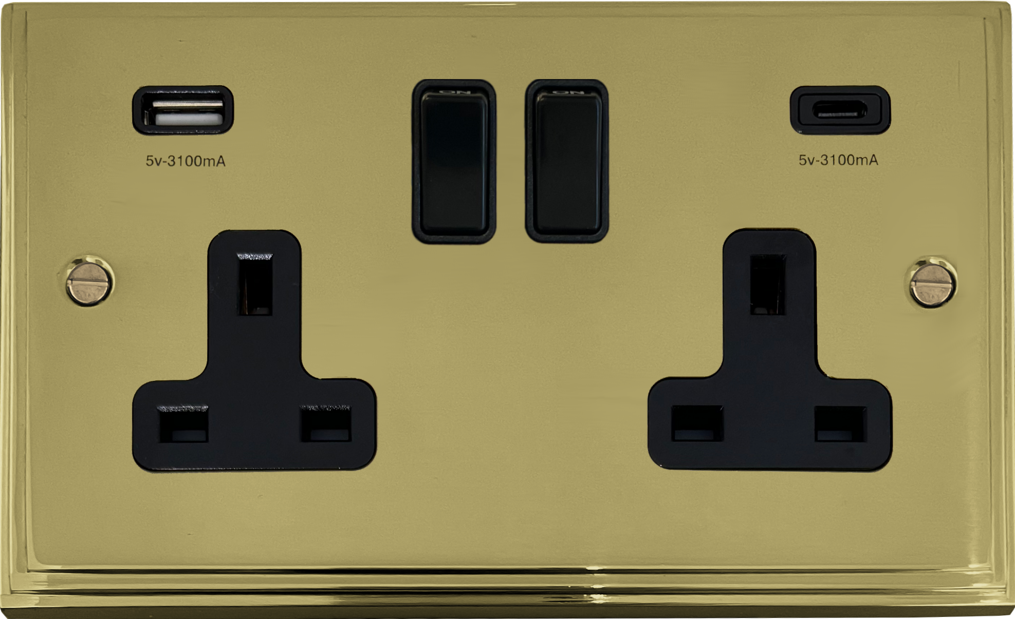 Victorian Polished Brass Double Socket with USB (USB-A and USB-C/Black Switches) - G+H VB911B