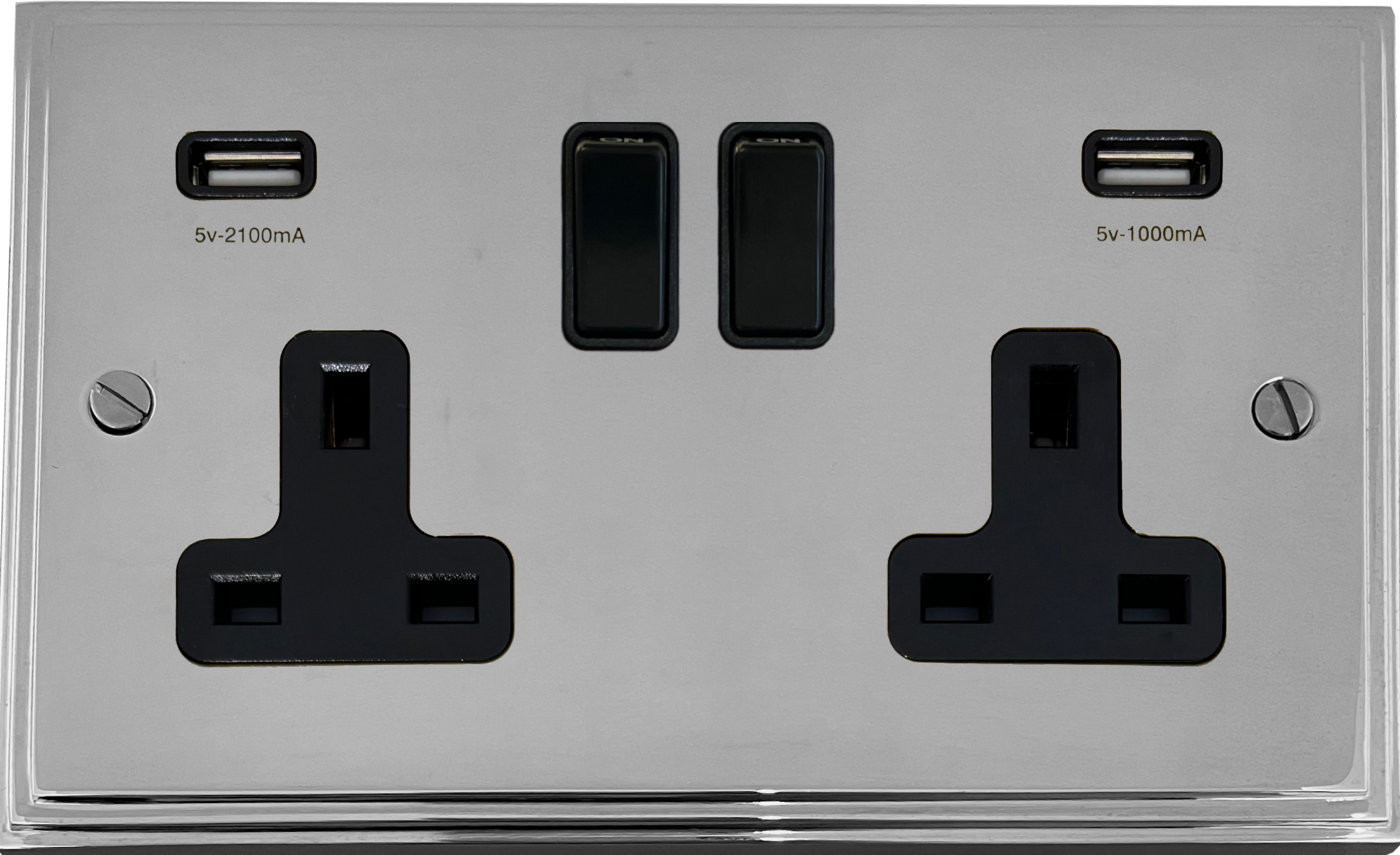 Victorian Polished Chrome Double Socket with USB (Black Switches) - G+H VC910B