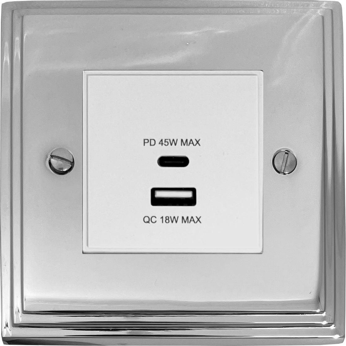 Victorian Polished Chrome USB Charger (Dual USB A + C Quick Charge) (1 Gang/White Insert) - G+H VC43W