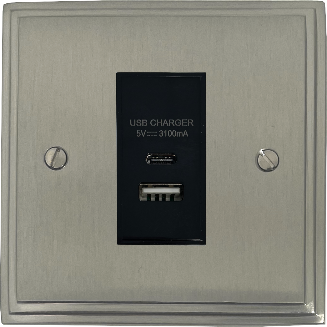 Victorian Satin Nickel USB Charger (USB-A and USB-C) (1 Gang/Black Insert) - G+H VSN41B