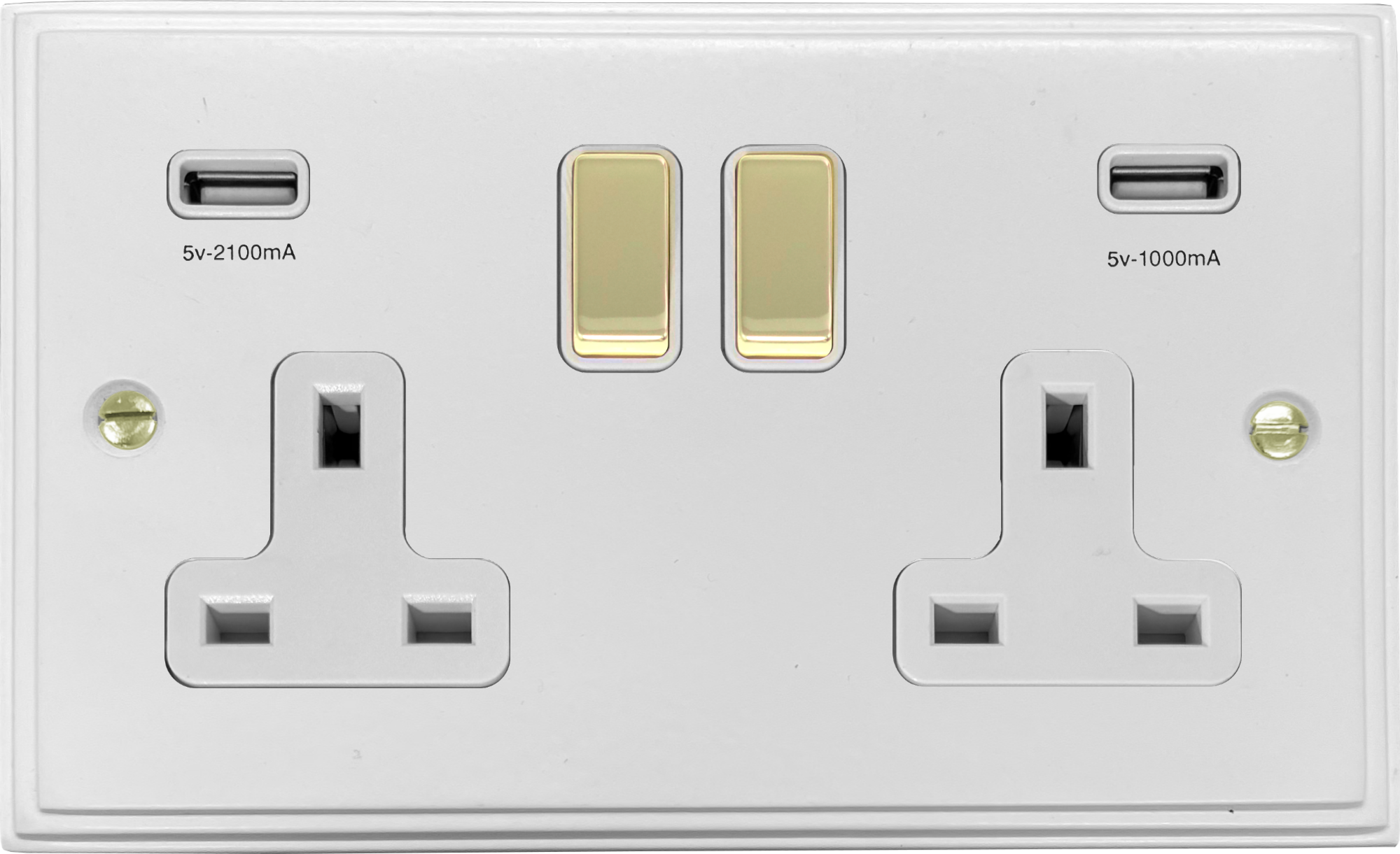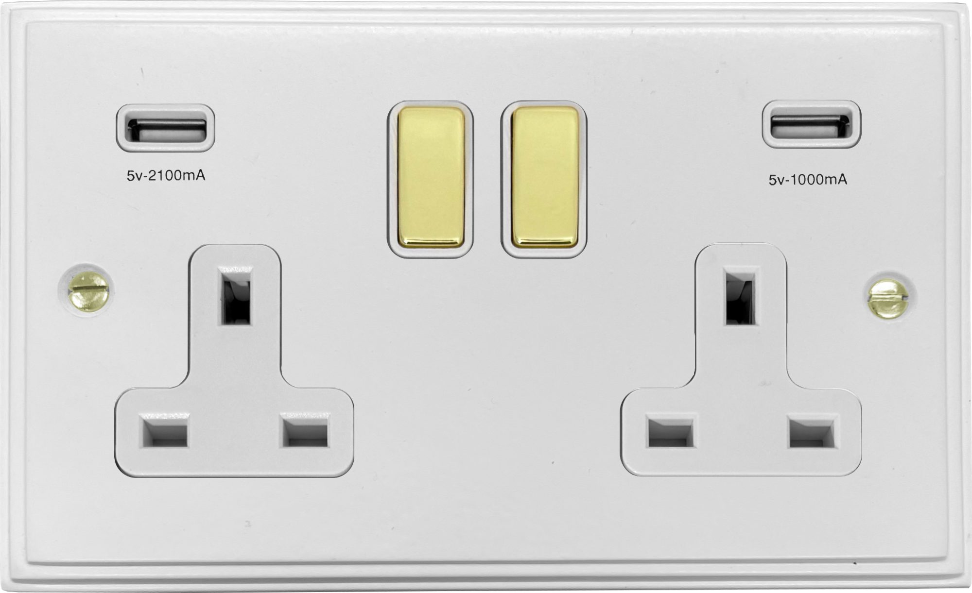 White Double Socket with USB (White Inserts/Polished Brass Switches) - G+H VW2910-PB