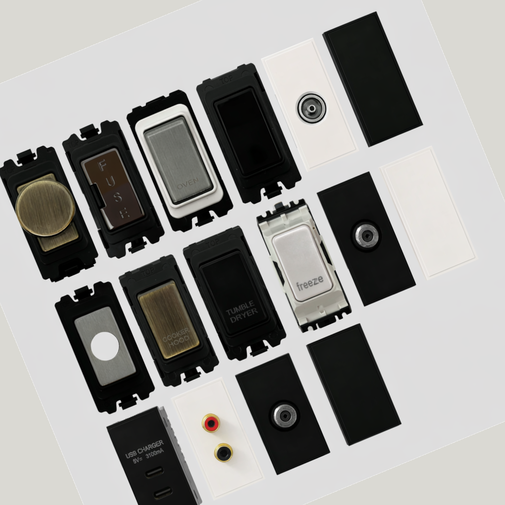 These accessories are designed to work with our different plates available. Please note the Euro modules and grid switches are not interchangeable. The Euro modules need to be fitted into our Euro plates. The grid switches need to be fitted into out grid switch plates.