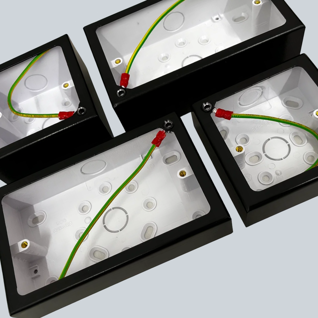 We have single or double pattress boxes available in a black finish. The pattress boxes are suitable for surface mounting all our ranges. They are available as 32mm and 44mm deep (exterior depth). They consist of a white plastic pattress box surrounded by a metal matt black surround.