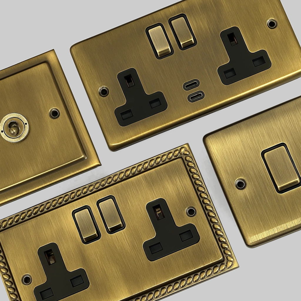 These ranges of antique brass sockets and switches are the perfect finish for traditional interiors. They plates are made from solid pressed brass with an antique finish. All the ranges come with a full selection of sockets, switches, toggles dimmers and data plates. We also have a number of spurs, cooker switches and other electrical accessories available in the same antique brass finish. Within each range we have a number of different style plates, from traditional plates, like Georgian and Victorian plates, to our more modern Deco, Contour and flat plates.