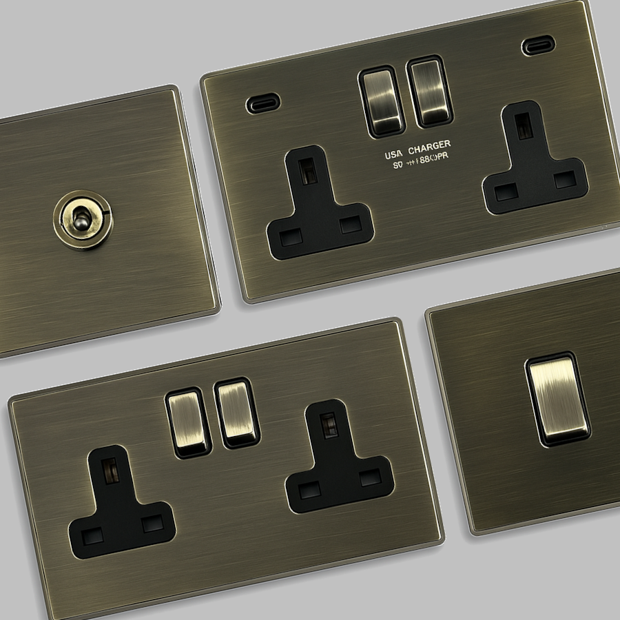 This is our range of Lexus Screwless antique brass sockets and switches.