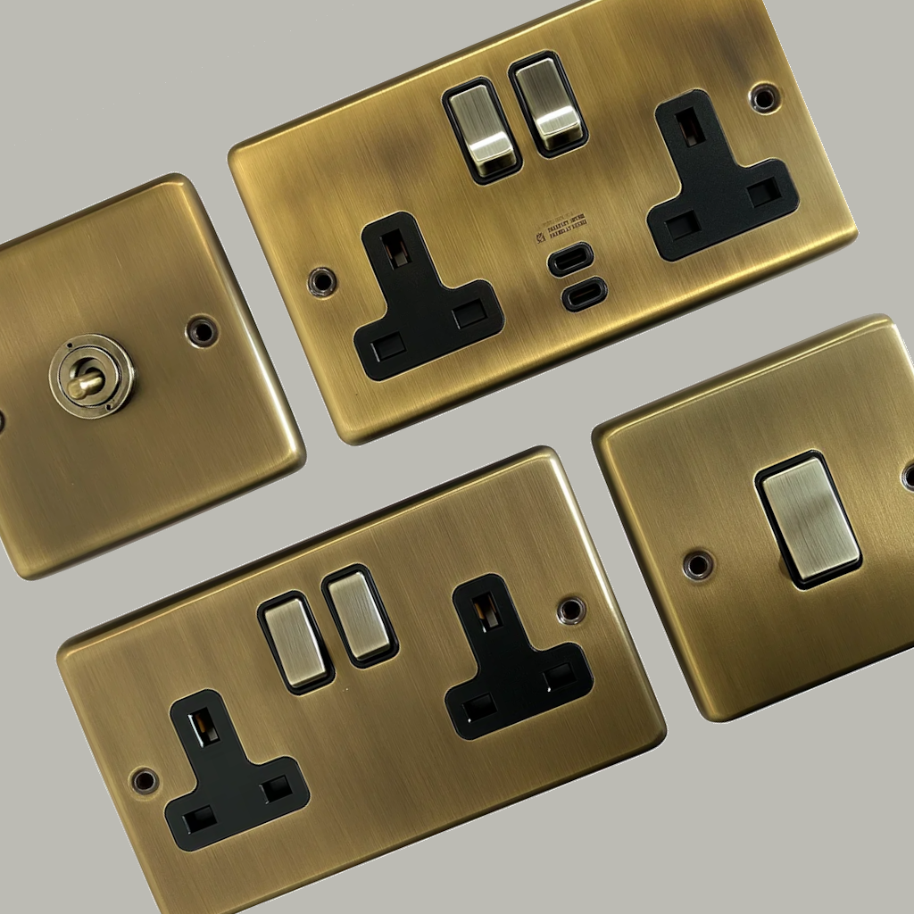 This is a range of metal light antique brass sockets and switches from our Contour collection.