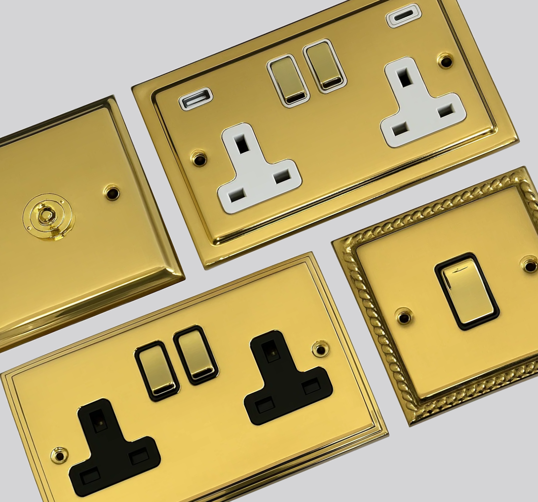 Our polished brass sockets and switches are made from pressed brass or cast brass, with a variety of different designs. They are finished with a polished brass finish, and finally lacquered for additional protection against general wear and tear. We do also have some unlacquered plates, which are finish with a polished brass finish, but without the lacquer they naturally tarnish over time.