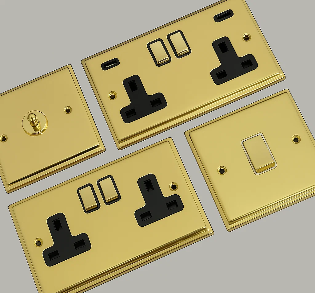 This is a full range of our Deco sockets and switches, finished in a polished brass finish.