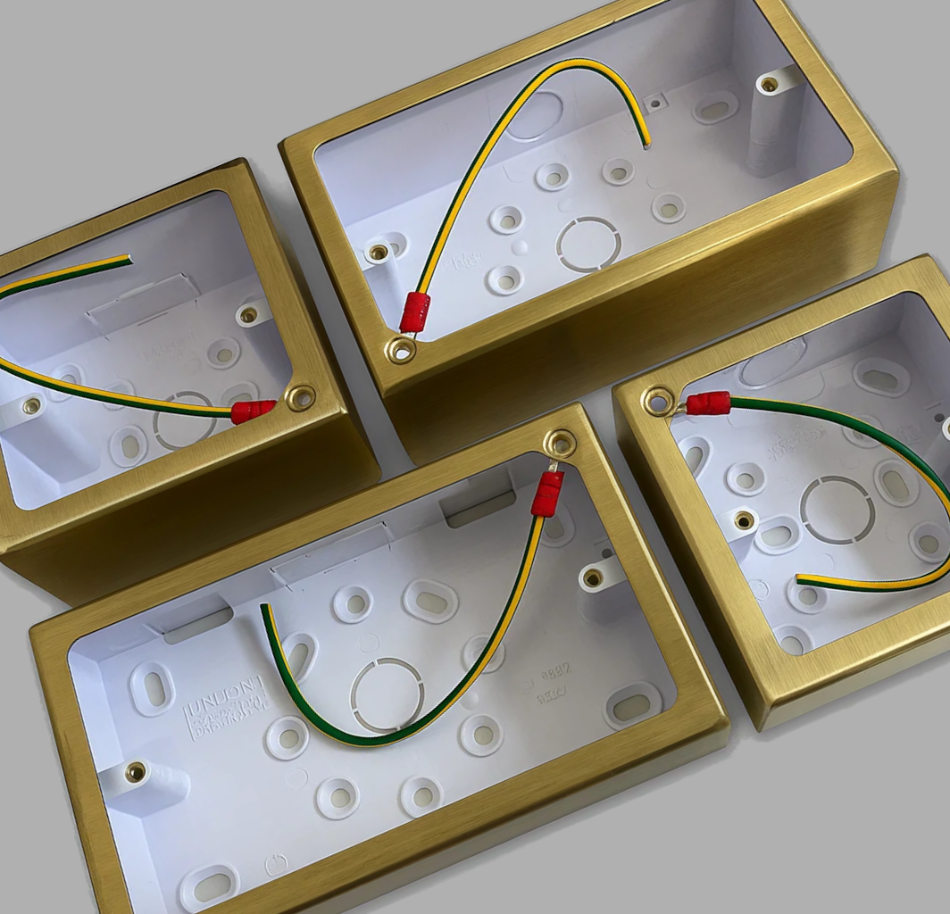 These pattress boxes are manufactured with a white plastic internal box, with a metal cover. The metal cover is finished with a satin brass coat and lacquered for protection. These are available in two different depths 34mm and 44mm, each with single and double options.