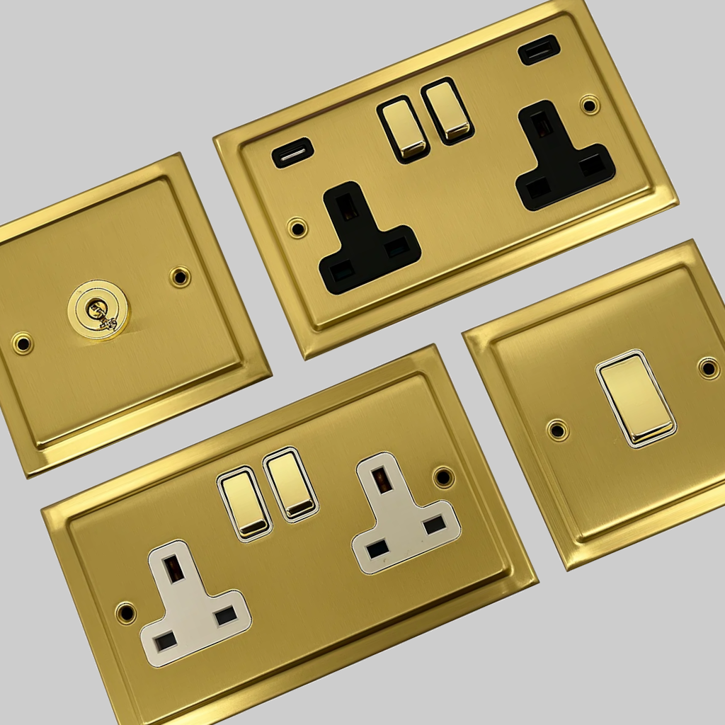 Within this range of satin brass plates, we have electrical sockets, switches, toggles and dimmers, all with the same brushed satin brass finish. We also have TV sockets, shaver points and cooker switches.
