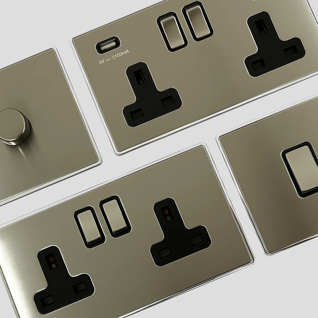 This is a complete range of screw less brushed steel socket and switches. It comes as a full range of sockets, USB sockets, light switches, dimmer switches and other electrical accessories.