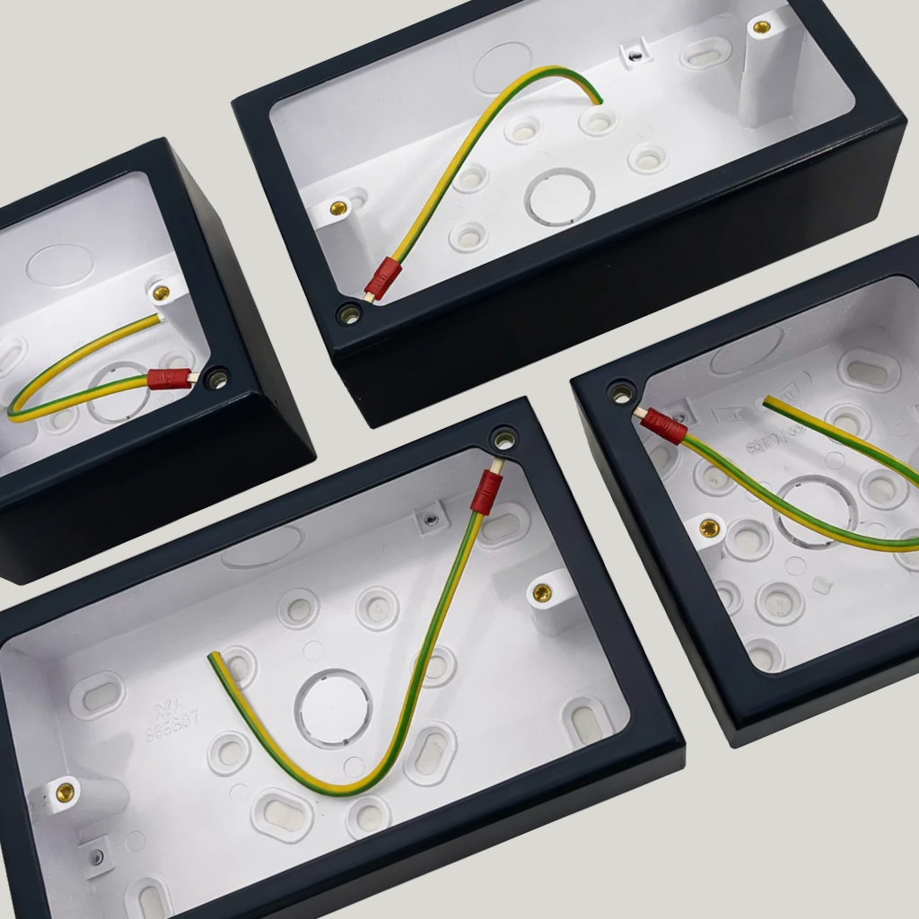 A range of royal blue pattress boxes available in 34mm and 44mm depths, with single and double options.