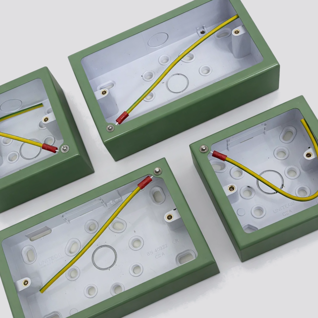 A range of light and dark grey pattress boxes available in 34mm and 44mm depths, with single and double options.