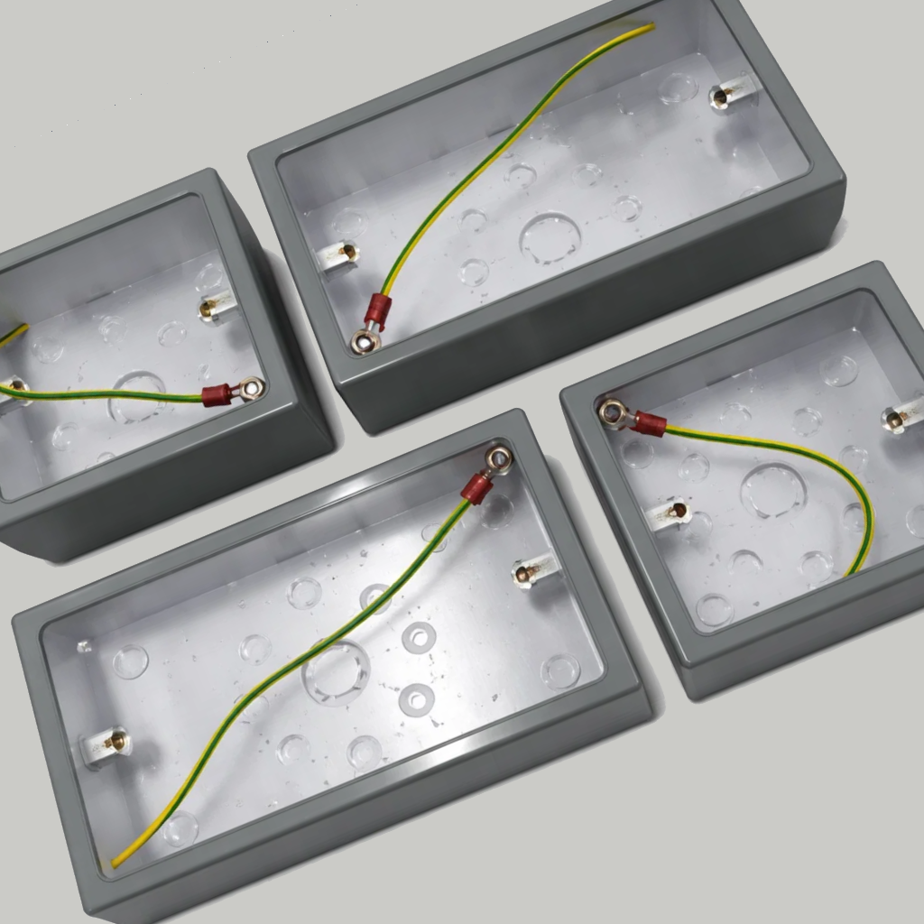 A range of light and dark grey pattress boxes available in 34mm and 44mm depths, with single and double options.