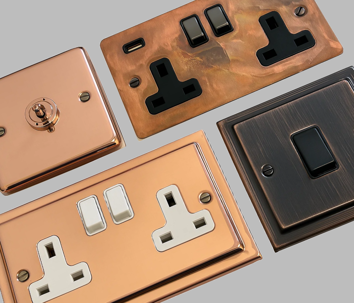 We have a number of different copper sockets and switches ranges available. Each finish is also available in a number of different plate styles.