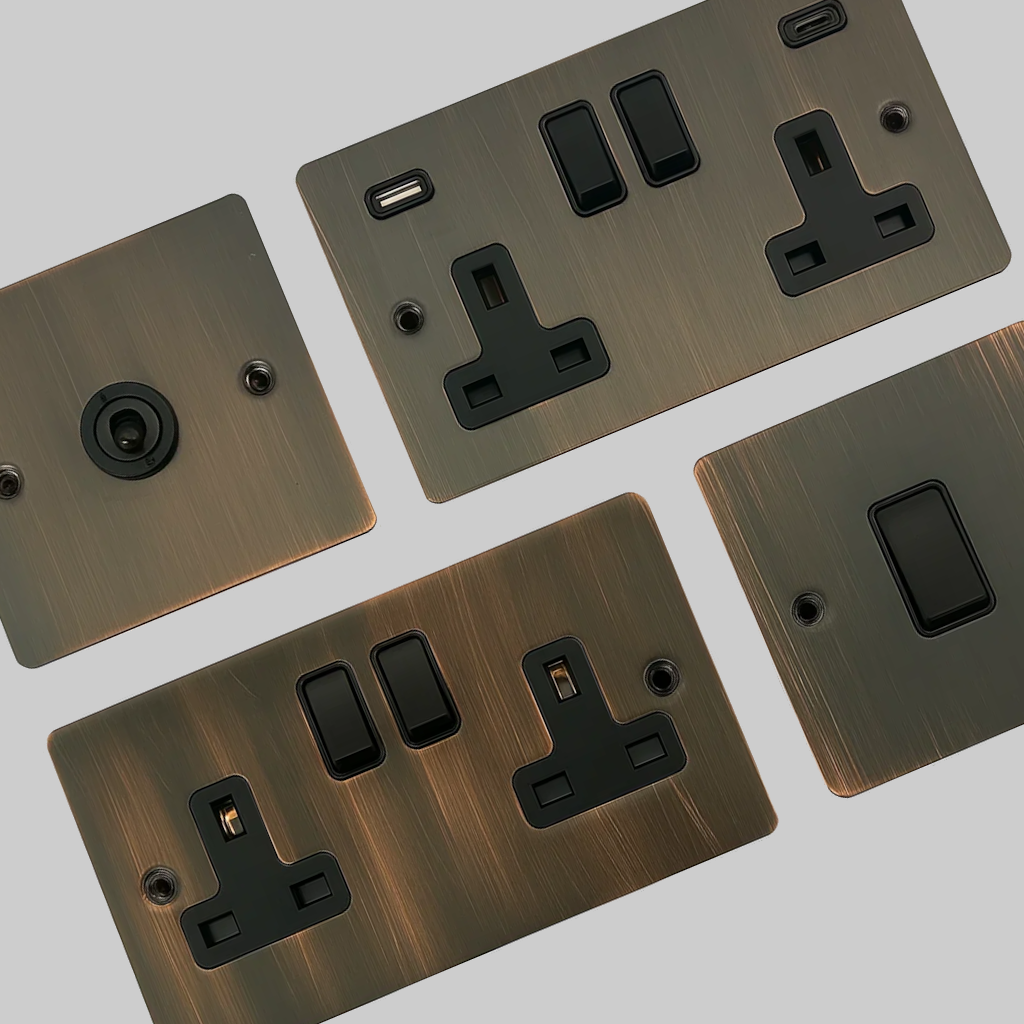 This is our comprehensive range of Flatline antique copper sockets, switches and electrical accessories. They are flat plates, made of copper, with an antique copper finish.