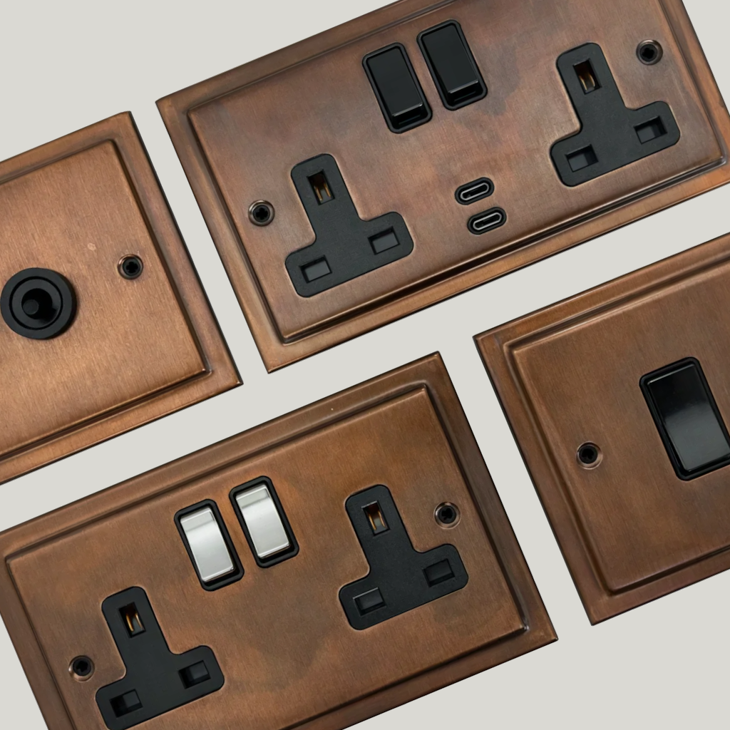 This is our range of Trimline tarnished copper sockets, switches and electrical accessories. The Trimline plate is one of our oversized electrical plates. They are made of copper with a hand tarnished finish.