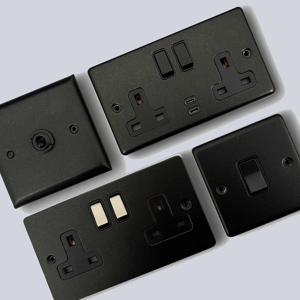 These ranges are metal with a powder coated graphite finish. Within each plate style, there are a comprehensive range of sockets, switches, toggles, dimmers and other electrical accessories. They are available with either black plastic more metal switches.
