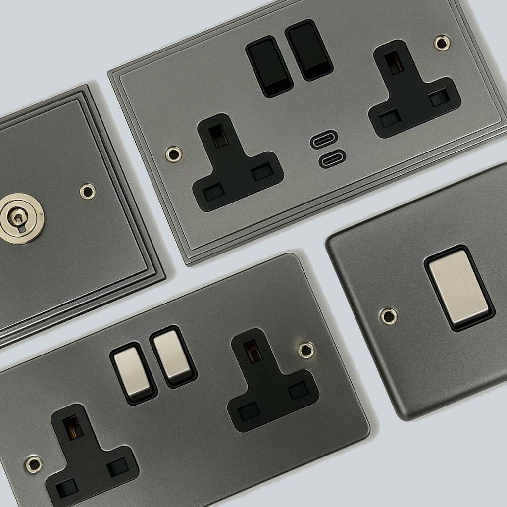 Our pewter range is available in a number of different plate styles. Each style has a full range of sockets, switches and dimmers you can kit out your room or your entire house with the same style sockets and switches. The pewter ranges are made from metal, with a powder coated finish. Please browse below to see the full range of each plates.