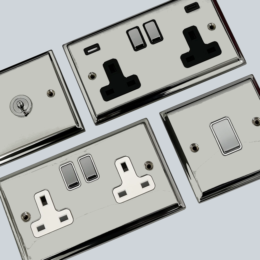 Check out our range of deco polished chrome sockets and switches, all finished with a decorative frame edging.