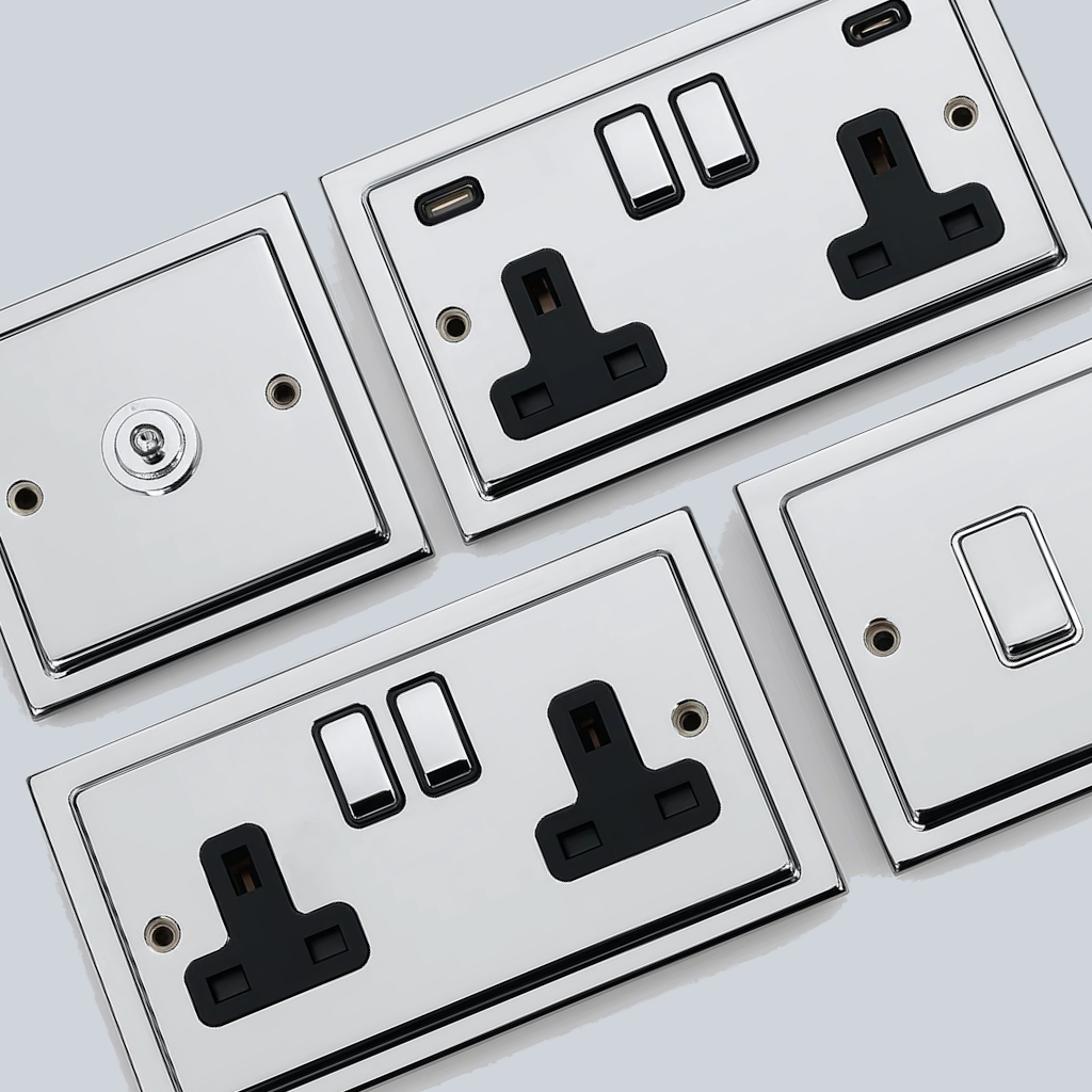 This is a comprehensive range of polished chrome sockets, switches and electrical accessories fixed to our Trimline plates. They are made from brass with a polished chrome finish.
