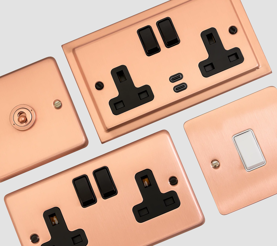 We have three different ranges of rose gold sockets available. These plates are made from copper wit a brushed rose gold finish.