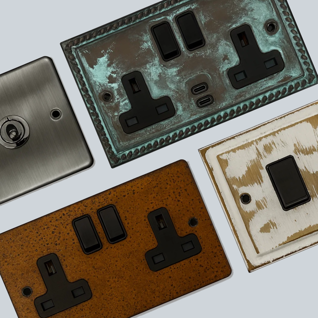 Within this range of Rustic sockets and switches, we have the rust, rustic pewter, rustic silver and Verdigris finishes. All of these finishes are available as comprehensive ranges of sockets, switches, dimmers, toggles and other electrical accessories. Please browse each range to see more details.