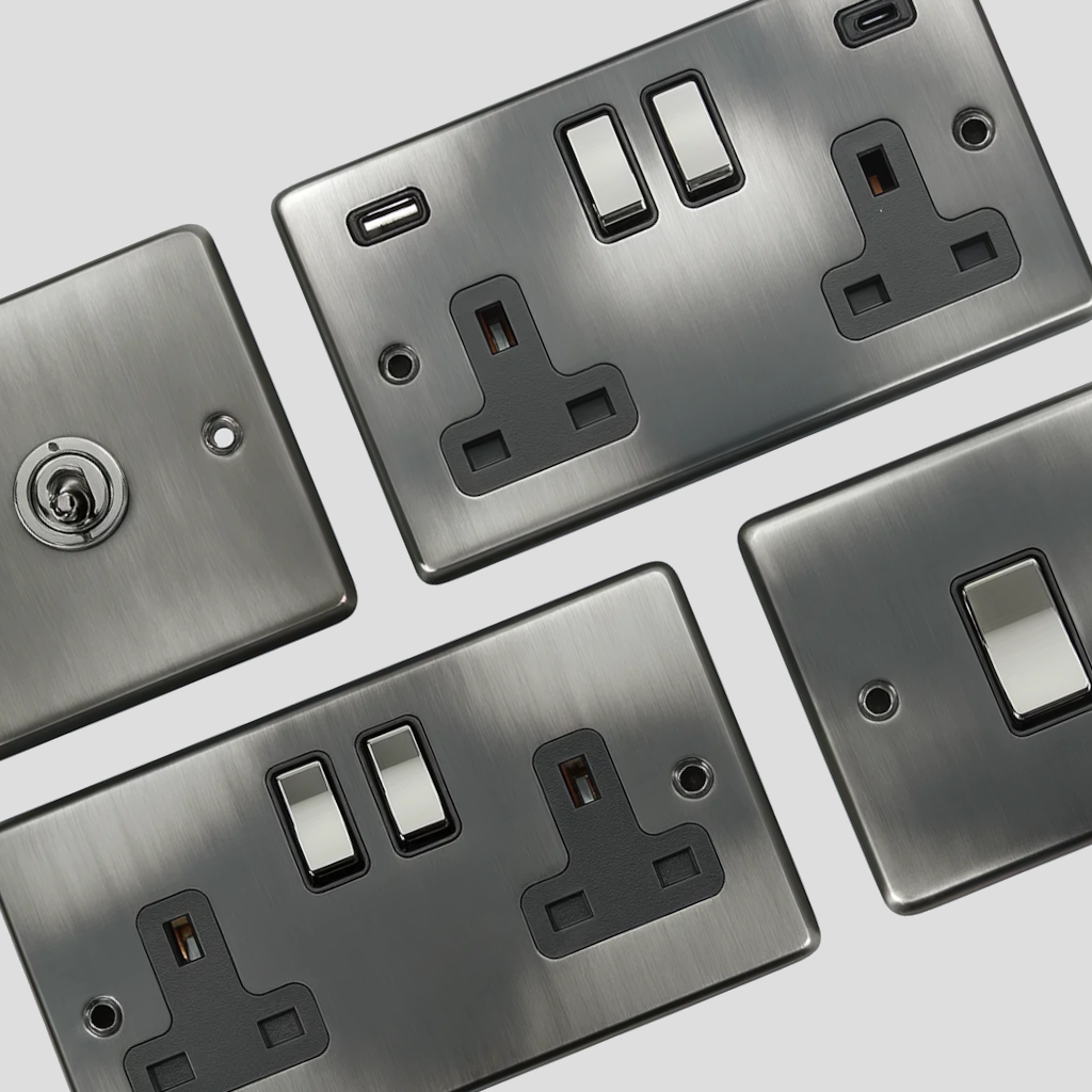 This is a full range of sockets, switches, toggles, dimmers and more. Completed with black plastic switches and inserts or black nickel, black dimmer caps and antique brass toggle switches.