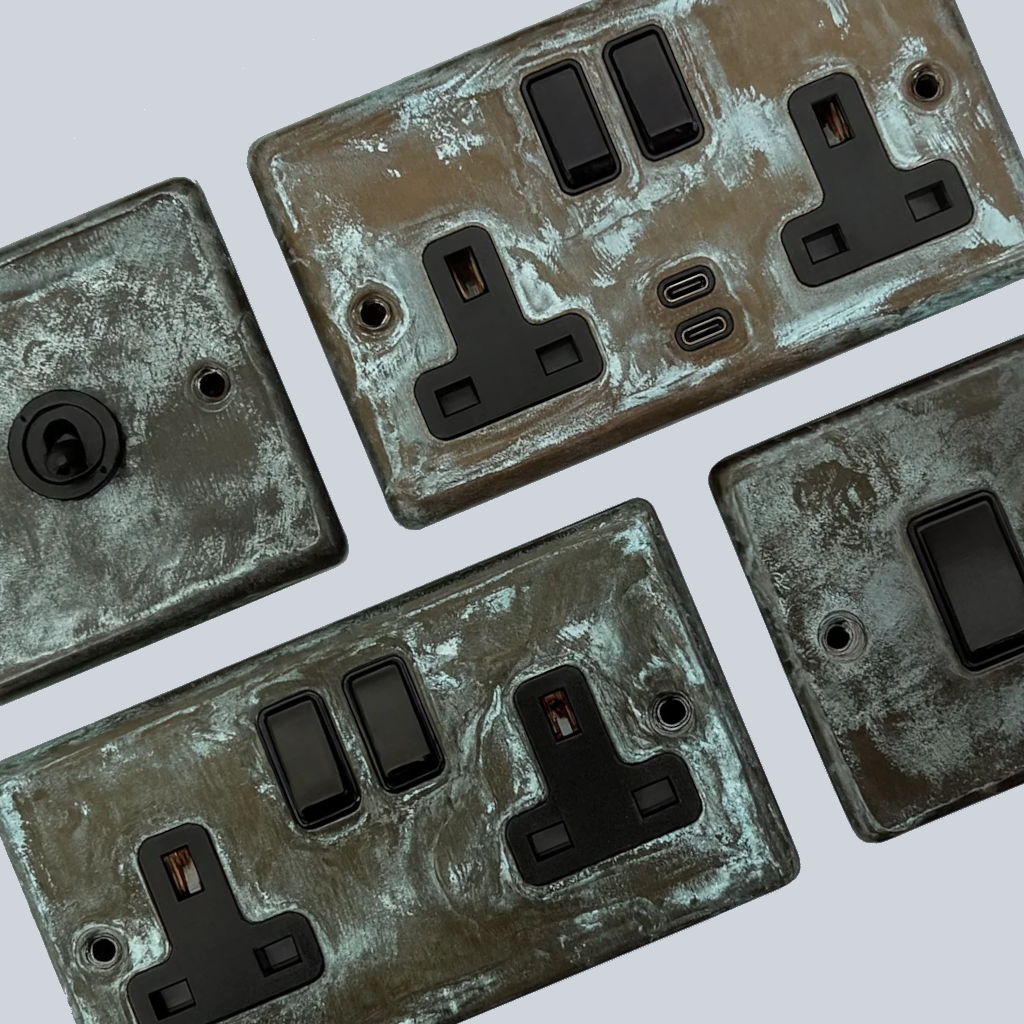 This is a full range of sockets, switches, dimmers and data plates. A standard Contour style plate with black plastic inserts and switches, with an antique brass finish to the toggles. Due to the nature of manufacturing the finish is non-uniform, so the finish on each plate will look different.