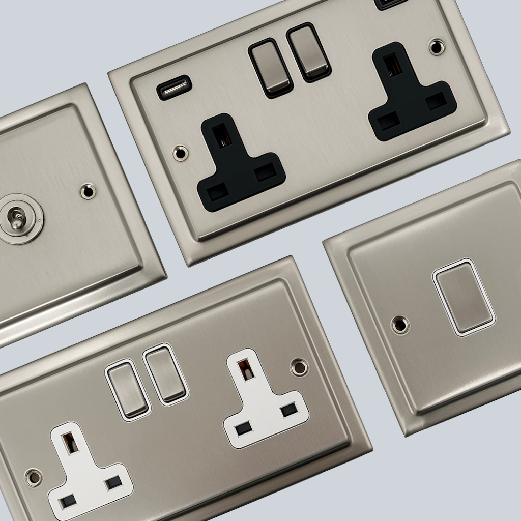 These are a full range of Trimline brushed nickel sockets and switches on a standard wall plate.