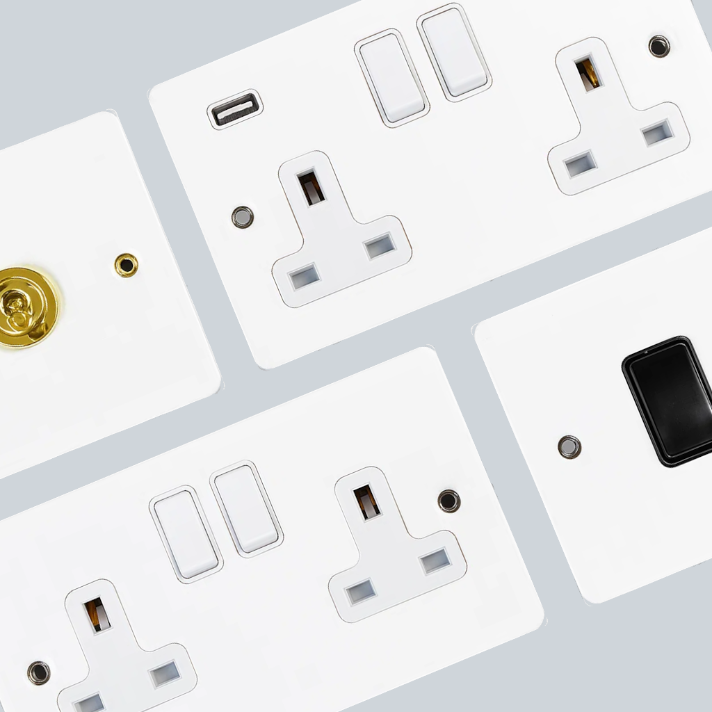 These flat white sockets and switches are available in a full range of sockets, switches, dimmers and data plates. The plates are made from mild steel with a powder coated white finish.